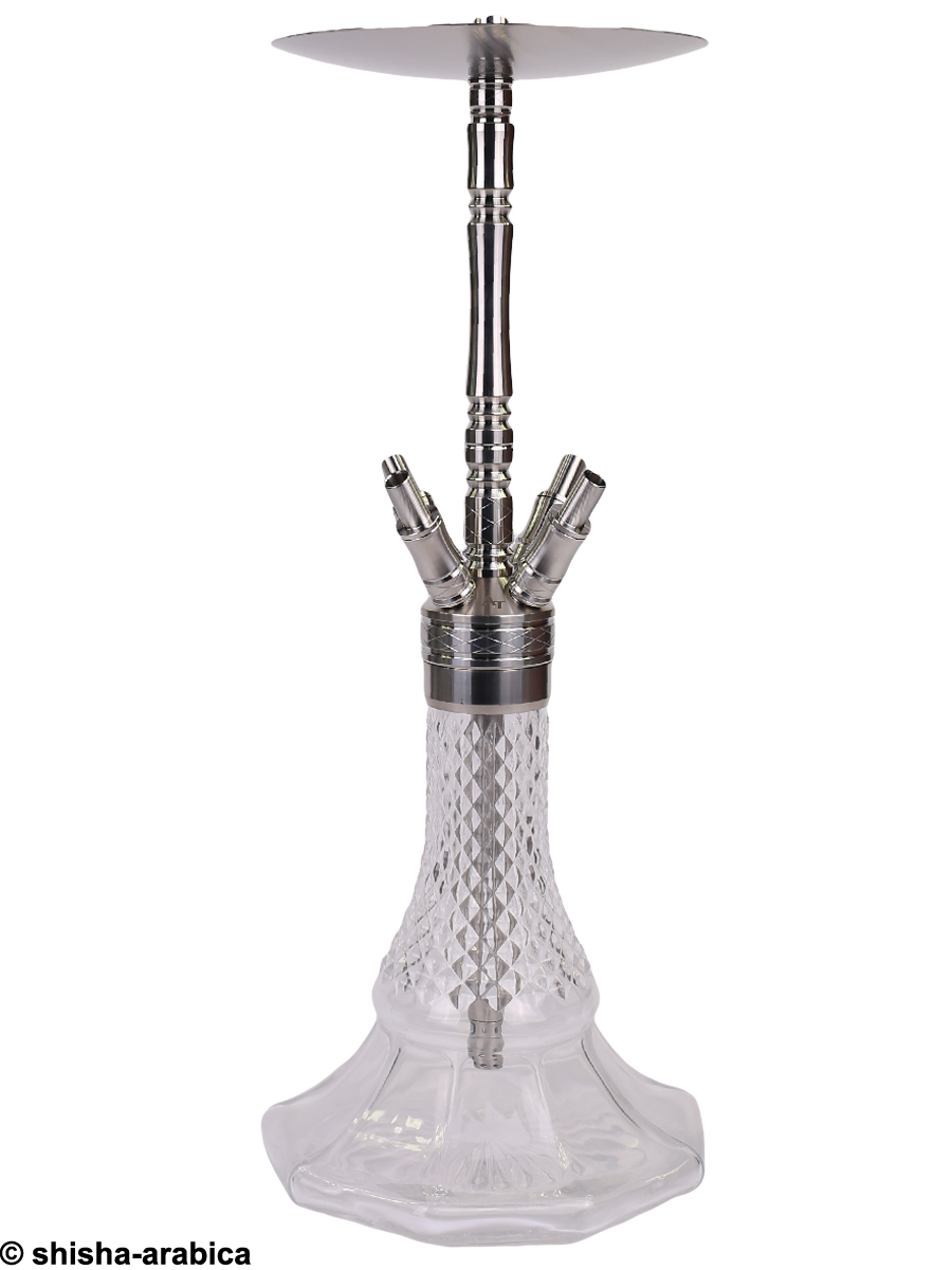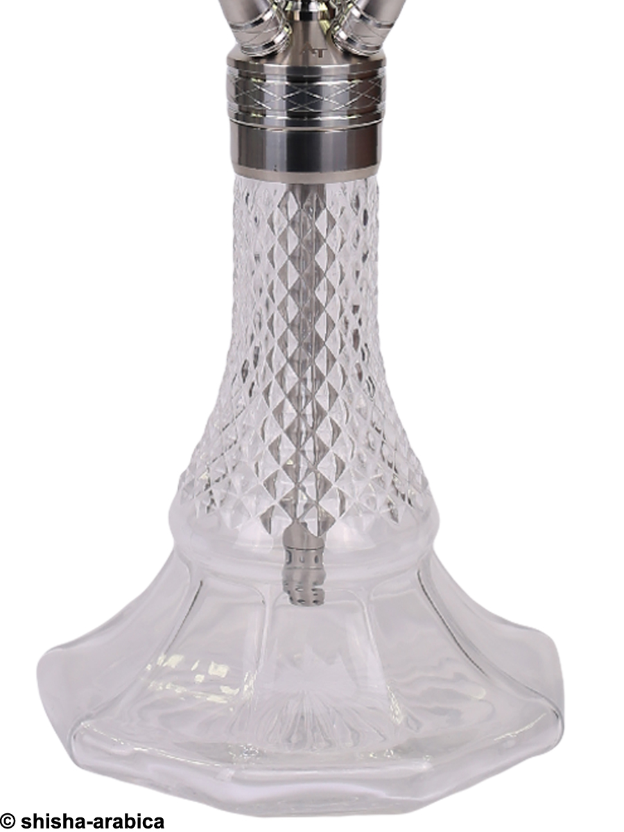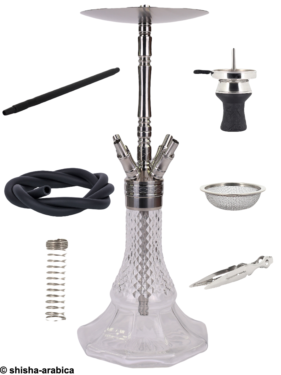 Alle Metallteile bestehen aus hochwertigem und rostfreiem Edelstahl und die Bowl ist aus Kristallglas gefertigt. Durch ihre breite Auflagefläche hat die Shisha einen guten Stand.
