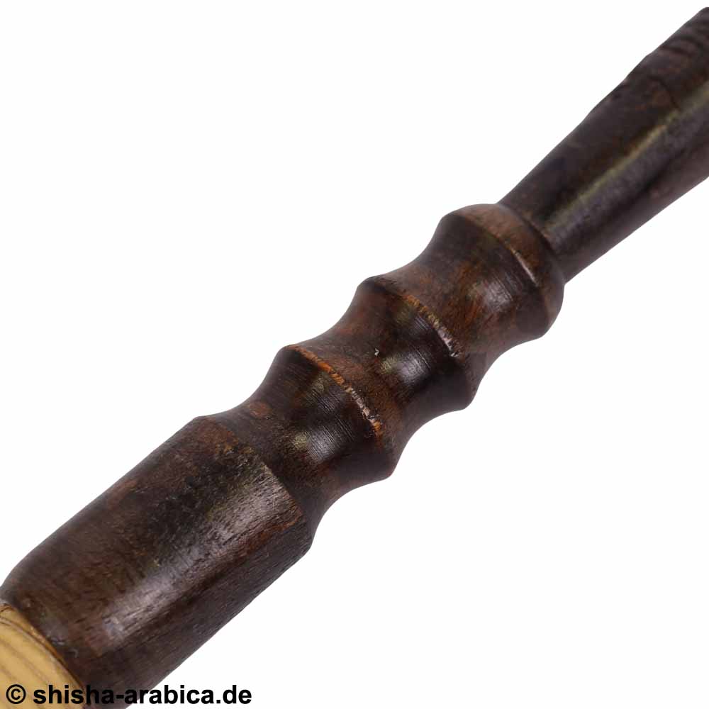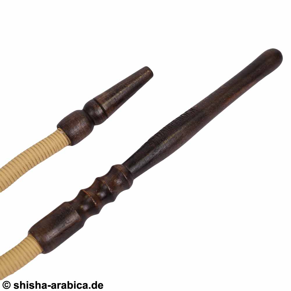 Das Mundstück des Schlauches ist aus Holz und im Inneren des Schlauches befindet sich eine Metallspirale.